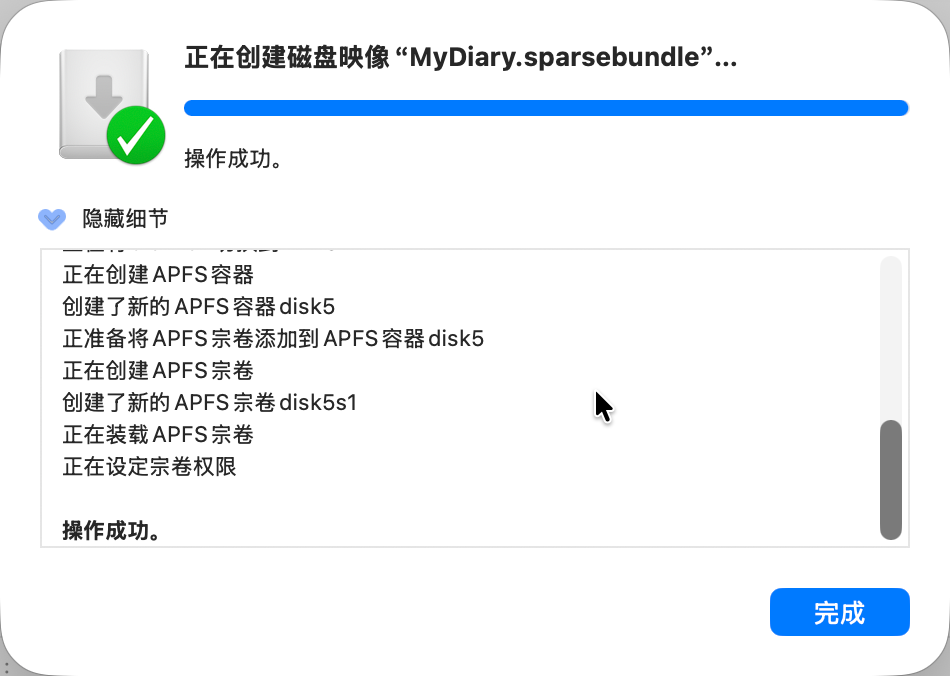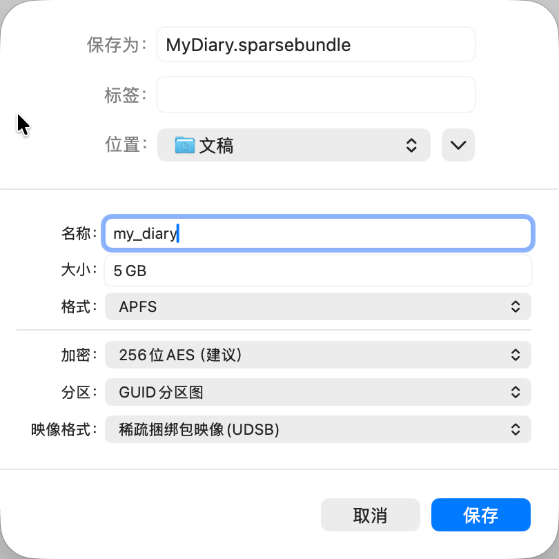 - 映像格式: 必须下拉选择 稀疏捆绑磁盘映像 (Sparse bundle disk image) 。这个选项的作用是“用多少占多少”。虽然我上面填了 5GB,但初始文件只有几十 MB,会随着写的日记内容变多而慢慢变大。